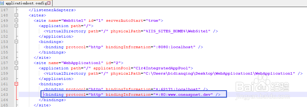 5、修改完成以后我們回到IIS Express的啟動配置文件applicationhost.config,會發(fā)現(xiàn)自動多了一條binding節(jié)點,如下圖所示: