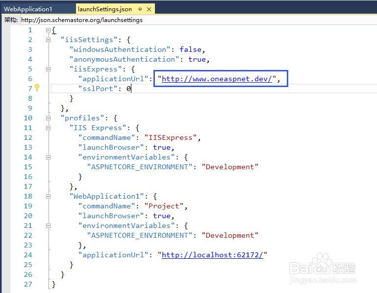 4、也可以直接在launchSettings.json文件中進(jìn)行修改,如下圖所示: