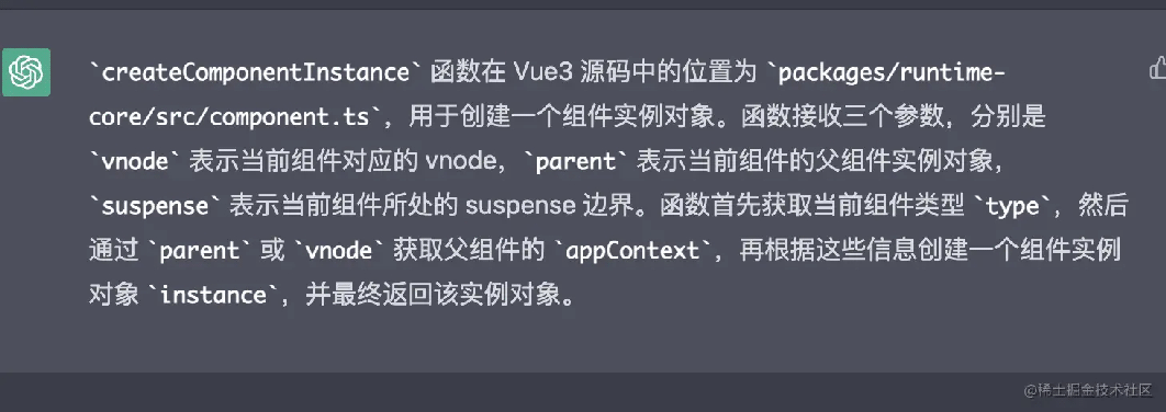 我們根據 ChatGPT 的解釋來閱讀代碼,發現createComponentInstance只是創建了組件的實例并返回。并沒有像它上面說的在函數中執行了 setupComponent,笨笨的 ChatGPT。
