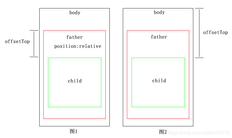 2. offsetParent:距離元素最近的一個具有定位的祖宗元素(relative,absolute,fixed),若祖宗都不符合條件,offsetParent為body。如下圖所示:獲取child的offsetTop,圖1的offsetParent為father,圖2的offsetParent為body。