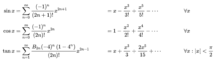 由于展開式是無限長的,使用 Sass 函數模擬時,不可能得到一個非常精確的值,但是在日常作圖下已經完全夠用了,以下是使用 Sass 函數模擬實現三角函數的 sin()、cos()、tan():
