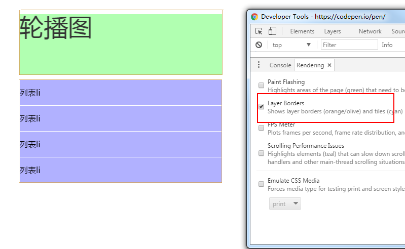 但是!在上面的圖中,我們并沒有給下面的list也添加任何能觸發(fā)生成 Graphics Layer 的屬性,但是它也同樣也有黃色的邊框,生成了一個獨立的復(fù)合層。