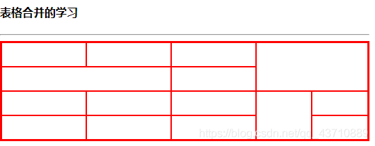 <h4>表格合并的學(xué)習(xí)</h4> <hr > <table border="2" cellpadding="10" cellspacing="0" bordercolor="red"> <tr height="35px"> <td width="100px"></td> <td width="100px"></td> <td width="100px"></td> <td width="200px"colspan="2" rowspan="2"></td> </tr> <tr height="35px"> <td colspan="2"></td> <td></td> </tr> <tr height="35px"> <td></td> <td></td> <td></td> <td rowspan="2" ></td> <td></td> </tr> <tr height="35px"> <td></td> <td></td> <td></td> <td></td> </tr> </table>