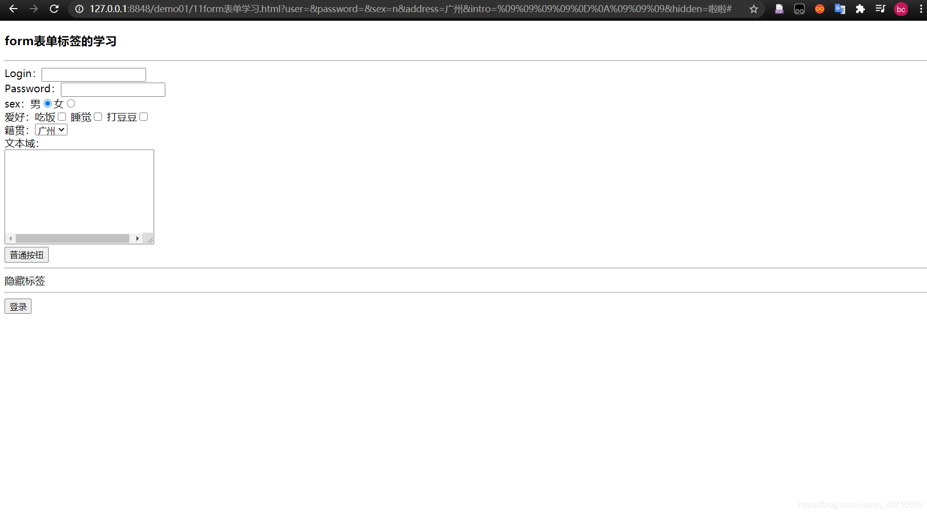 <!DOCTYPE html><html> <head> <meta charset="utf-8"> <title>form表單標(biāo)簽的學(xué)習(xí)</title> </head> <body> <h3>form表單標(biāo)簽的學(xué)習(xí)</h3> <hr > <form action="#" method="get"> Login:<input type="text" id="" name="user" value="" /><br> Password:<input type="password" name="password" value="" /><br> sex:男<input type="radio" name="sex" value="n" checked="checked" />女<input type="radio" name="sex" value="w"/><br> 愛好:吃飯<input type="checkbox" name="fav" value="1"/> 睡覺<input type="checkbox" name="fav" value="2"/> 打豆豆<input type="checkbox" name="fav" value="3"/> <br> 籍貫:<select name="address"> <option value="北京">北京</option> <option value="上海">上海</option> <option value="廣州" selected="selected">廣州</option> </select><br> 文本域:<br> <textarea rows="10" cols="30" name="intro"> </textarea> <br> <input type="button" name="" id="" value="普通按鈕" /> <br> <hr > 隱藏標(biāo)簽<input type="hidden" name="hidden" id="" value="啦啦" /> <hr > <input type="submit" id="" name="" value="登錄"/> </form> </body></html>
