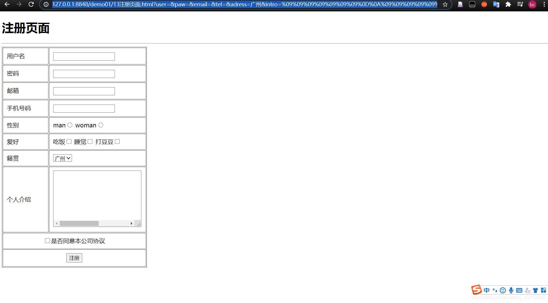 <!DOCTYPE html><html> <head> <meta charset="utf-8"> <title>注冊(cè)頁面</title> </head> <body> <h1>注冊(cè)頁面</h1> <hr > <form action="" method="get"> <table border="" cellpadding="10px" cellspacing=""> <tr> <td width="100px">用戶名</td> <td><input type="text" name="user" id="" value="" /></td> </tr> <tr> <td>密碼</td> <td><input type="password" name="paw" /></td> </tr> <tr> <td>郵箱</td> <td><input type="email" id="" value="" name="email" /></td> </tr> <tr> <td>手機(jī)號(hào)碼</td> <td><input type="tel" name="tel" id="" value="" /></td> </tr> <tr> <td>性別</td> <td> man<input type="radio" name="sex" id="" value="1" /> woman<input type="radio" name="sex" id="" value="1" /> </td> </tr> <tr> <td>愛好</td> <td> 吃飯<input type="checkbox" name="fav" id="" value="1" /> 睡覺<input type="checkbox" name="fav" id="" value="2" /> 打豆豆<input type="checkbox" name="fav" id="" value="3" /> </td> </tr> <tr> <td>籍貫</td> <td> <select name="adress"> <option value="北京">北京</option> <option value="上海">上海</option> <option value="廣州" selected="selected">廣州</option> </select> </td> </tr> <tr> <td>個(gè)人介紹</td> <td> <textarea rows="10px" cols="30px" name="intro"> </textarea> </td> </tr> <tr> <td colspan="2" align="middle"> <input type="checkbox" name="agree" id="agree" value="1" />是否同意本公司協(xié)議 </td> </tr> <tr> <td colspan="2" align="middle"> <input type="submit" value="注冊(cè)"/> </td> </tr> </table> </form> </body></html>