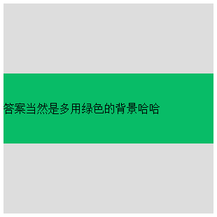 <div id="box"> <div id="child"> 答案當(dāng)然是多用綠色的背景哈哈 </div></div>css代碼:#box { width: 300px; height: 300px; background: #ddd; display: flex; flex-direction: column; justify-content: center;} #child { width: 300px; height: 100px; background: #08BC67; line-height: 100px;}運行結(jié)果如下: