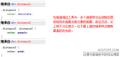 就近原則其實(shí)不算是新的結(jié)論,想一下,如果把每一個(gè)父級(jí)元素都作為當(dāng)前元素,然后按照前邊的“元素本身樣式大于繼承樣式”的原則推理一遍,就可以明白,離得最近的父級(jí)元素的繼承樣式優(yōu)先級(jí)最高,是很合理的。