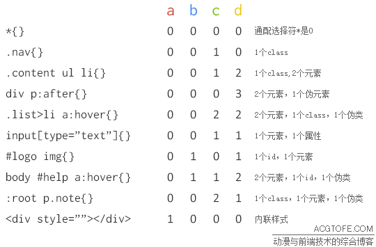 看過(guò)這些例子后,請(qǐng)理解為,簡(jiǎn)單的分類計(jì)數(shù),正是css中的戰(zhàn)斗力測(cè)量方法。(a,b,c,d) 這種形式中,abcd分別是不同的數(shù)量級(jí),a>b>c>d,和數(shù)字的大小比較方法相同,從高位開(kāi)始,如果高位數(shù)字相同,則取低一位數(shù)字比較,以此類推。選擇符權(quán)重計(jì)算值最大的樣式規(guī)則中的屬性,覆蓋其他的樣式規(guī)則中的同名屬性。