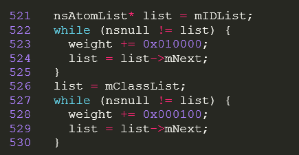(a,b,c,d) 中,a代表的內(nèi)聯(lián)樣式實(shí)際是存在于html代碼中,只能取值為0或1,所以和其他的較為不同。后邊的bcd雖說(shuō)是不同的數(shù)量級(jí),但詳細(xì)說(shuō)來(lái)有多大差距呢?請(qǐng)看下面這一段Firefox瀏覽器源代碼: