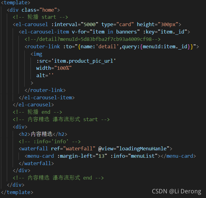 <script>import MenuCard from "@/components/menu-card.vue" //引入的組件1import Waterfall from "@/components/waterfall.vue"http://引入的組件2import {getBanner,getMenus} from "@/service/api.js"http://引入的封裝好的api方法// 引入 注冊 使用export default { name: "home", components: { MenuCard: MenuCard, Waterfall }, data(){ return { banners:[], menuList:[], page:1, pages:5 } }, mounted(){ getBanner().then(({data})=>{ this.banners=data.list; // console.log(this.banners) }), // 1. getMenus({page:this.page}).then(({data})=>{ console.log(data) // this.menuList=data.list;當傳了頁碼就不能這么賦值了 this.menuList=data.list;//存了第一頁的數據 // this.pages=Math.ceil(data.total/data.page_size) }) }, methods:{ loadingMenuHanle(){ console.log("在外部監聽的滾動") this.page++; // 2. if(this.page > this.pages){this.$refs.waterfall.isloading=false;return; } this.$refs.waterfall.isloading=true; getMenus({page:this.page}).then(({data})=>{this.menuList.push(...data.list);//在第一次數據加載完成后再繼續添加(push)渲染五條數據this.$refs.waterfall.isloading=false; }) } }}</script>注意事項: