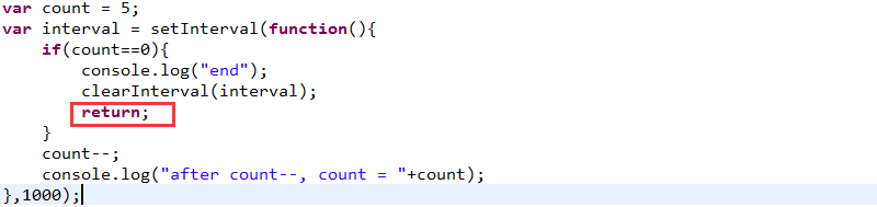 我們驚奇的發現,并不是我們想象中的那樣,setInterval這個函數,并不會在清理定時器之后,就退出,后續的操作還是會執行。為了讓清除定時器之后的代碼不再執行,我們可以直接進行return返回。