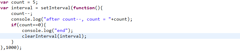 這里要重點說的是清除定時器的時機,我們一般是需要進行一個條件判斷,比如 var count=5,我們定時執行count--操作,當count==0的時候,清除定時器,一般情況下,我們的代碼是這樣寫的。