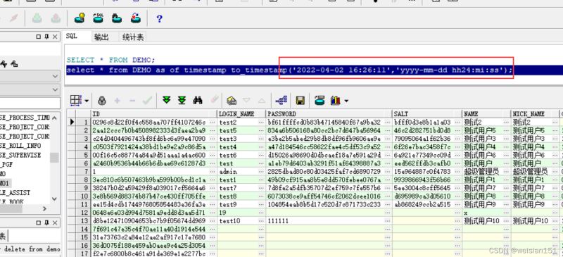 select * from DEMO as of timestamp to_timestamp(‘2022-04-02 16:26:11",‘yyyy-mm-dd hh24:mi:ss");