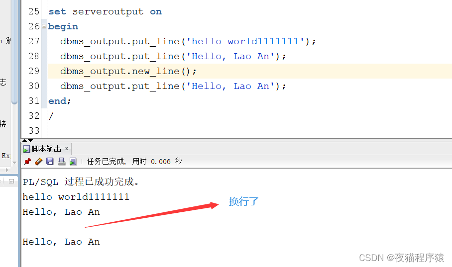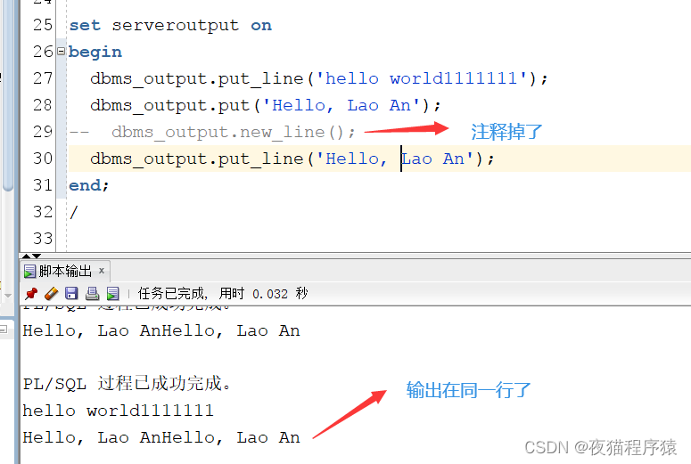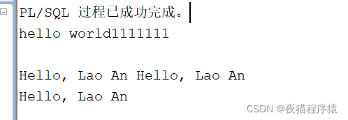 set serveroutput onbegin dbms_output.put_line("hello world1111111"); dbms_output.put("Hello, Lao An"); dbms_output.new_line(); dbms_output.put_line("Hello, Lao An");end;/
