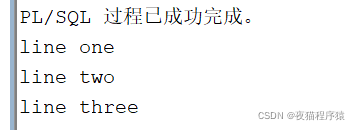declare v_data dbms_output.chararr; --先聲明局部變量 v_numlines number; begin --enable the buffer first. dbms_output.enable(1000000); --設置緩沖區的大小 dbms_output.put_line("line one"); dbms_output.put_line("line two"); dbms_output.put_line("line three"); v_numlines := 3; dbms_output.get_lines(v_data, v_numlines); --array, index for v_counter in 1..v_numlines loop dbms_output.put_line(v_data(v_counter)); end loop; end;/輸出: