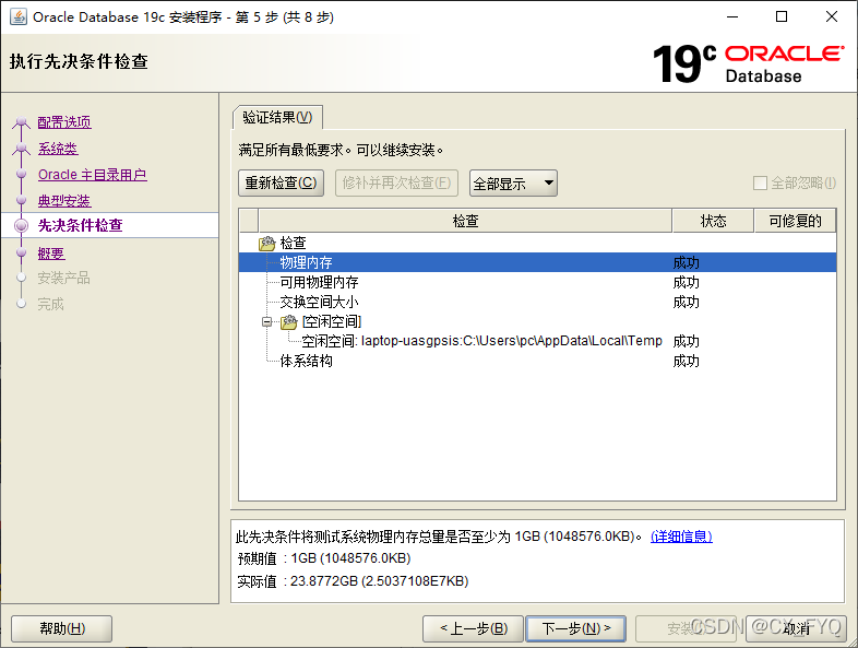 - 6、確認安裝,并檢查你的電腦是否符合Oracle安裝的最低配置要求,以及電腦空間是否足夠