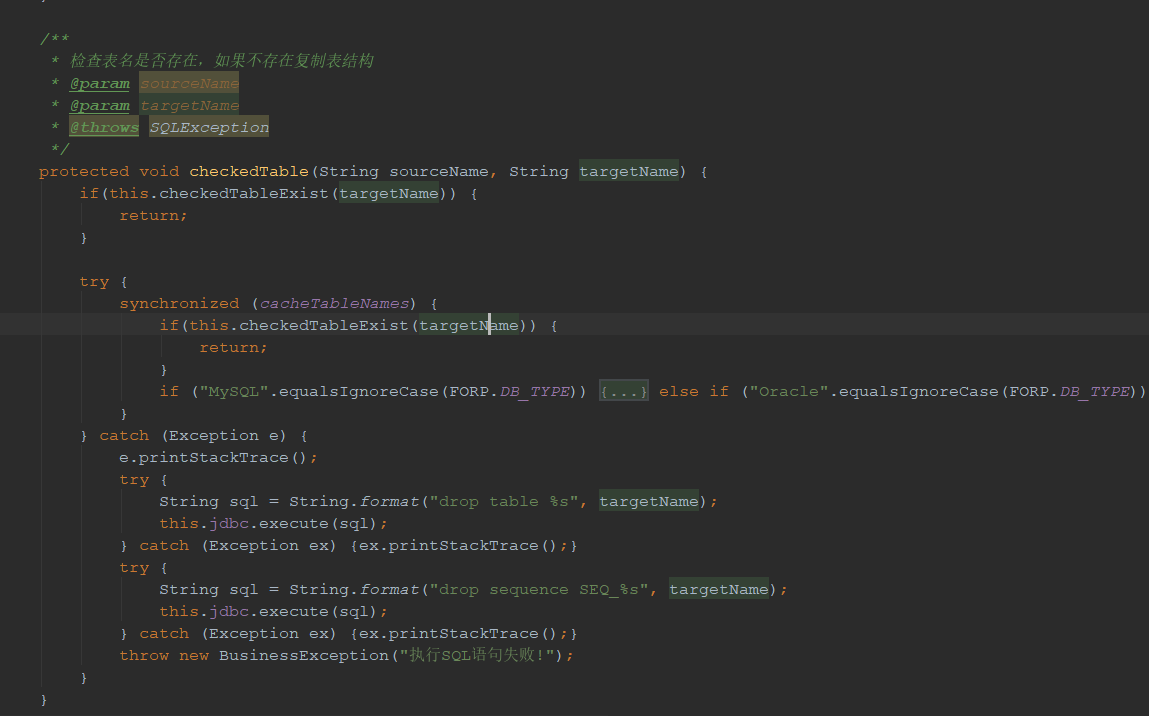 通過后續排查,發現可能是因為代碼中判斷相關代碼查詢結果有誤,導致相關表被誤刪除,暫時通過注釋下方刪除表結構代碼避免問題復發,相關原因后續繼續排查