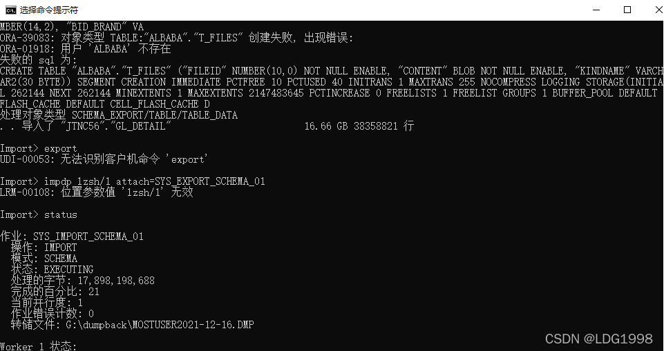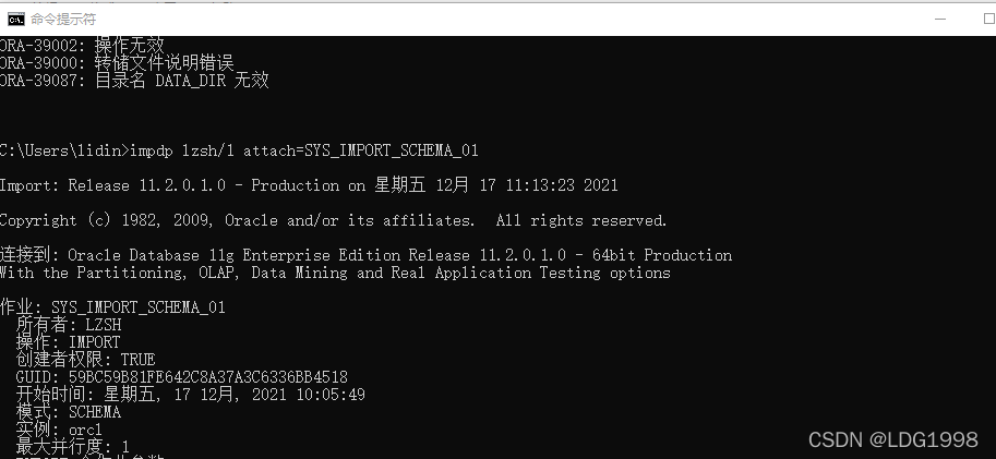 impdp 剛剛作業導入的用戶名/密碼 attach=SYS_EXPORT_SCHEMA_01