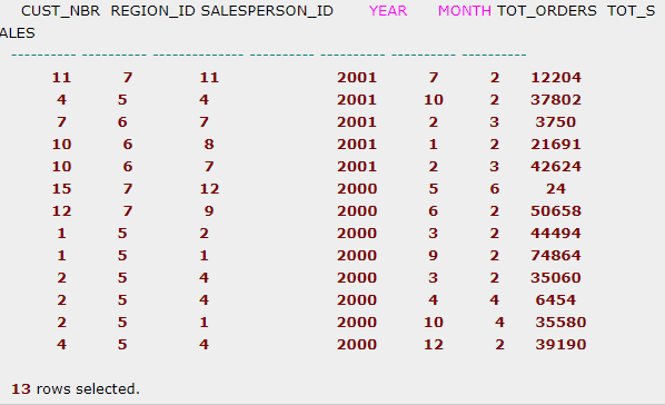 select region_id, customer_id, sum(customer_sales) cust_sales, sum(sum(customer_sales)) over(partition by region_id) ran_total, rank() over(partition by region_id order by sum(customer_sales) desc /* nulls last */) rankfrom user_ordergroup by region_id, customer_id;