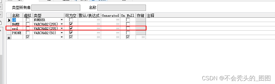 在這里我們可以看到整體的代碼邏輯是沒有問題的,但是再看看數據表結構發現:pwd 字段為小寫,其實PL自動生成的創建表的腳本中,表名和字段名都加了雙引號。雙引號在Oracle中表示區分大小寫,Oracle是嚴格區分大小寫的,未使用雙引號時默認全部大寫??赡芎芏嗳硕紩`認為oracle是不區分大小寫的,原因是我們在寫查詢語句的時候,大小寫無所謂,結果都是一樣的,這只是個表面現象,只要你不使用雙引號表示區分大小寫,oracle會默認把你寫的腳本全部轉換為大寫的。