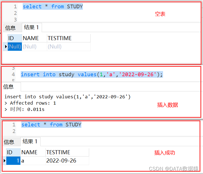 SYS@helowin>insert into zxy.study values(3,"c","2022-09-26");1 row created.SYS@helowin>select * from zxy.study;ID NAME TESTTIME---------- -------------------- -------------------------------------------------- 2 b 2022-09-26 3 c 2022-09-26 1 a 2022-09-26