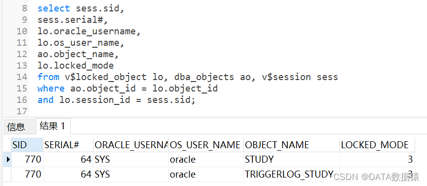 select sess.sid,sess.serial#,lo.oracle_username,lo.os_user_name,ao.object_name,lo.locked_modefrom v$locked_object lo, dba_objects ao, v$session sesswhere ao.object_id = lo.object_idand lo.session_id = sess.sid;