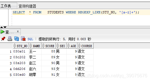 SELECT * FROM STUDENTS WHERE REGEXP_LIKE(STU_NO, "[a-z]+");