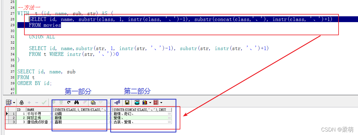 --方法一WITH t (id, name, sub, str) AS ( SELECT id, name, substr(class, 1, instr(class, "、")-1), substr(concat(class,"、"), instr(class, "、")+1) FROM movies UNION ALL SELECT id, name,substr(str, 1, instr(str, "、")-1), substr(str, instr(str, "、")+1) FROM t WHERE instr(str, "、")>0) SELECT id, name, subFROM tORDER BY id;