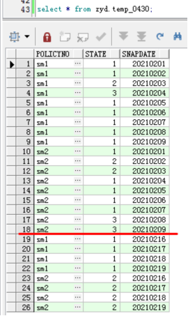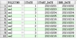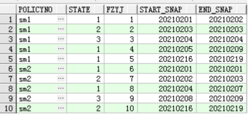 此表是一張鏡像表,policyno列代表一個保單號,state列代表這個保單號在snapdate當天的最后一次狀態(state每天可能會變很多次,鏡像表只保留snapdate時間點凌晨的最后一次狀態),snapdate代表當天做鏡像的時間,現在有個需求,我們想取出來這個保單號連續保持某個狀態的起止時間,例如: