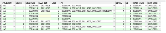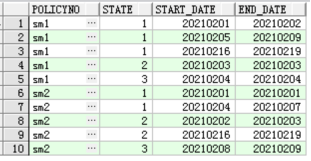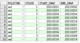 保單號sm1保持狀態1的起止時間為2021020120210202,然后在20210203時候變成了狀態2,又在20210204時候變成了狀態3,最終又在2021020520210209時間段保持在狀態1,然后鏡像表的程序可能期間出現過問題,在20210210開始到20210215日沒有鏡像成功,直到20210216日才恢復,20210216~20210219日保單號sm1的狀態一直保持為1,后續還有可能繼續變,那么,上面說的保單sm1的幾個狀態的連續時間,我們想要的結果為: