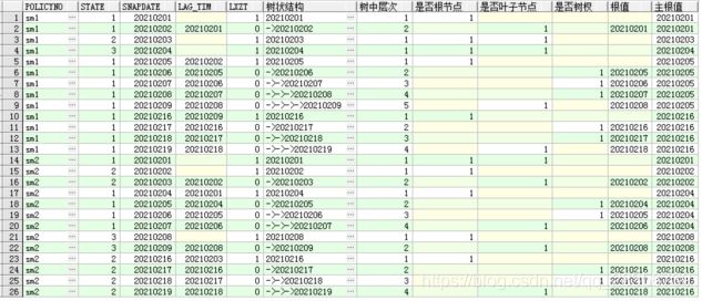 從上面能清晰的看出來,每一次連續狀態的開始日期作為每個樹的根,分支節點即樹杈和葉子節點的關系一步步拓展開來,分析上面數據我們能夠知道,如果我們想要獲取每個保單狀態連續時間范圍,以上面的數據現有分布方式,現在就可以:通過policyno,state,主根值進行group by 取snapdate的最大最小值,類似前面兩個寫法的最終步驟;