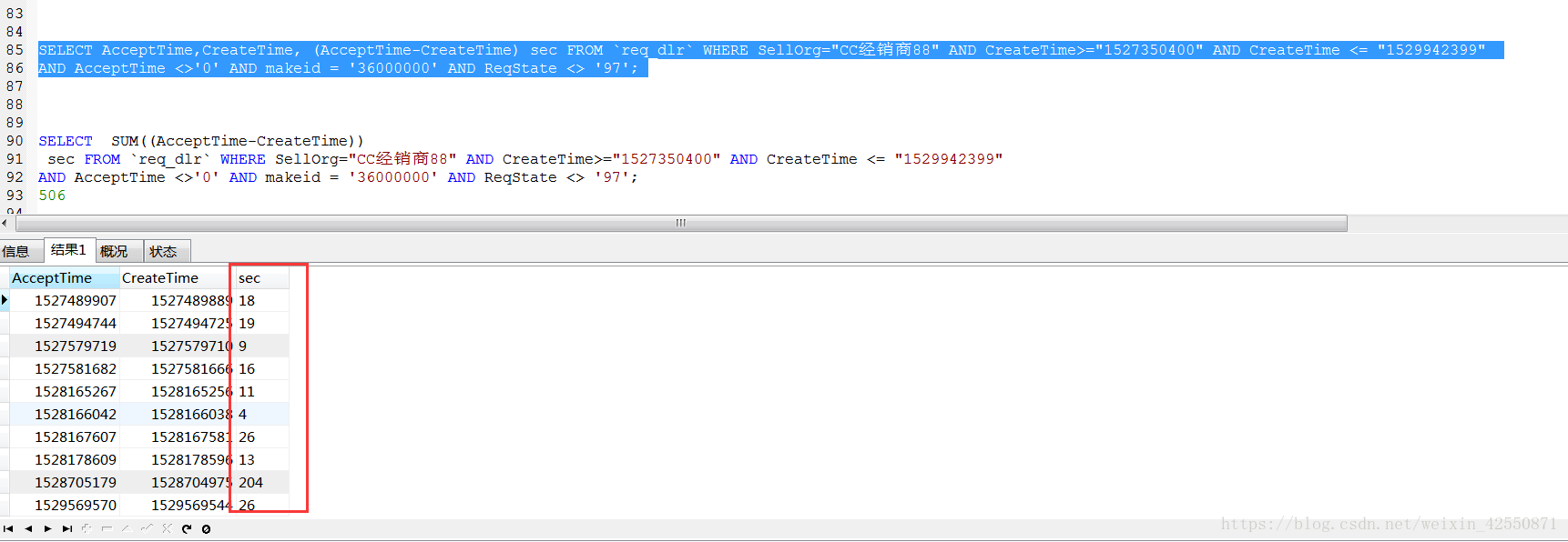 SELECT AcceptTime,CreateTime, (AcceptTime-CreateTime) sec FROM `req_dlr` WHERE SellOrg="CC經銷商88" AND CreateTime>="1527350400" AND CreateTime <= "1529942399"?AND AcceptTime <>"0" AND makeid = "36000000" AND ReqState <> "97";
