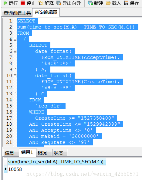 SELECTsum(time_to_sec(M.A)- TIME_TO_SEC(M.C))FROM(SELECTdate_format(FROM_UNIXTIME(AcceptTime),"%H:%i:%S") A,date_format(FROM_UNIXTIME(CreateTime),"%H:%i:%S") CFROM`req_dlr`WHERECreateTime >= "1527350400"AND CreateTime <= "1529942399"AND AcceptTime <> "0"AND makeid = "36000000"AND ReqState <> "97") AS MWHEREM.A <= "19:00:00"AND M.A >= "09:00:00";