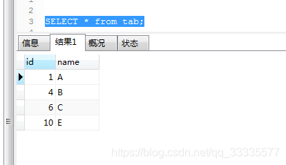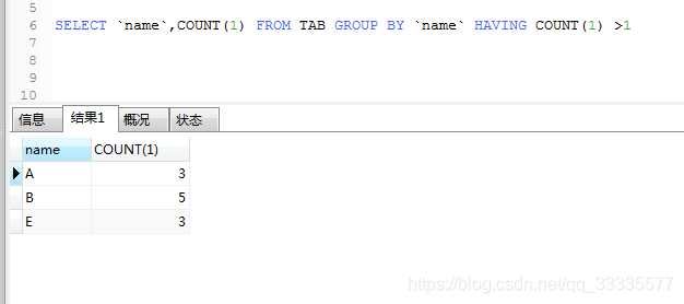 CREATE TABLE `tab` (? `id` int(11) NOT NULL AUTO_INCREMENT,? `name` varchar(20) DEFAULT NULL,? PRIMARY KEY (`id`)) ENGINE=InnoDB AUTO_INCREMENT=13 DEFAULT CHARSET=utf8;?-- ------------------------------ Records of tab-- ----------------------------INSERT INTO `tab` VALUES ("1", "A");INSERT INTO `tab` VALUES ("2", "A");INSERT INTO `tab` VALUES ("3", "A");INSERT INTO `tab` VALUES ("4", "B");INSERT INTO `tab` VALUES ("5", "B");INSERT INTO `tab` VALUES ("6", "C");INSERT INTO `tab` VALUES ("7", "B");INSERT INTO `tab` VALUES ("8", "B");INSERT INTO `tab` VALUES ("9", "B");INSERT INTO `tab` VALUES ("10", "E");INSERT INTO `tab` VALUES ("11", "E");INSERT INTO `tab` VALUES ("12", "E");使用HAVING關(guān)鍵字篩選出表中重復(fù)數(shù)據(jù)