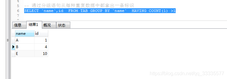 可以通過分組語句從每種重復(fù)數(shù)據(jù)中都拿出一條標(biāo)識