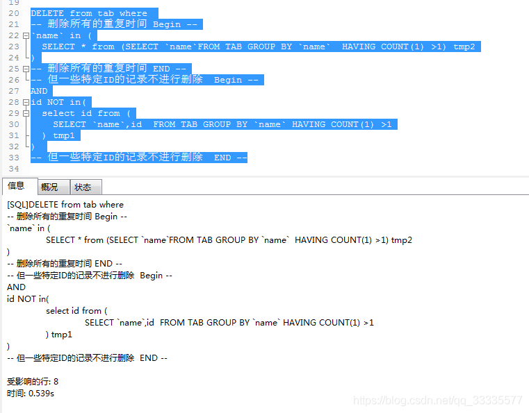 DELETE from tab where-- 刪除所有的重復(fù)時間 Begin --`name` in (?? ?SELECT * from (SELECT `name`FROM TAB GROUP BY `name`? HAVING COUNT(1) >1) tmp2)-- 刪除所有的重復(fù)時間 END ---- 但一些特定ID的記錄不進(jìn)行刪除? Begin --ANDid NOT in(?? ?select id from (?? ??? ?SELECT `name`,id? FROM TAB GROUP BY `name` HAVING COUNT(1) >1?? ?) tmp1)-- 但一些特定ID的記錄不進(jìn)行刪除? END --