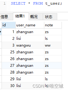 -- 方法二SELECT * FROM t_user WHERE id NOT IN ( SELECT MIN(id) FROM t_user GROUP BY user_name)
