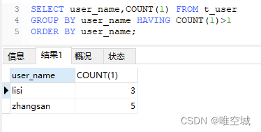 -- 方法一SELECT * FROM t_user WHERE user_name IN (?? ?SELECT user_name FROM t_user GROUP BY user_name HAVING COUNT(1)>1)?AND id NOT IN (?? ?SELECT MIN(id) FROM t_user GROUP BY user_name HAVING COUNT(1)>1)