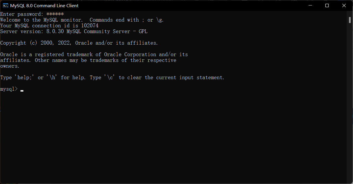在Mysql安裝完成后,Mysql命令行會(huì)自動(dòng)配置在計(jì)算機(jī)上,在菜單中找到MySql 8.0 Command Line Client,輸入密碼即可進(jìn)入。(密碼在安裝過(guò)程中設(shè)定的)