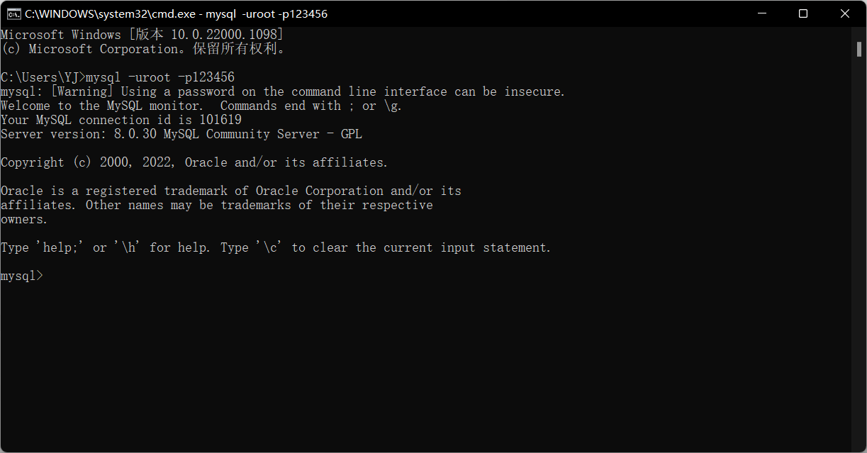 cd D:cd D:\Program Files\MySQL\MySQL Server 8.0\binmysql -u root -p 123456