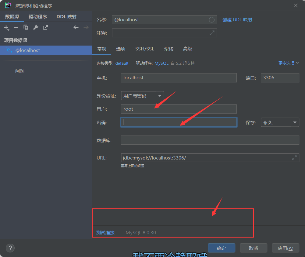 面板中,左上部分列出了已經(jīng)建立的數(shù)據(jù)庫(kù)連接,點(diǎn)擊各項(xiàng),右側(cè)會(huì)展示當(dāng)前連接的配置信息,General面板中,可以配置數(shù)據(jù)庫(kù)連接的信息,如主機(jī)、用戶名、密碼等,不同數(shù)據(jù)庫(kù)配置信息不完全相同,填入數(shù)據(jù)庫(kù)URL,注意,URL后有個(gè)選項(xiàng),可以選擇直接填入url,那么就不需要單獨(dú)填主機(jī)名、端口等信息了。