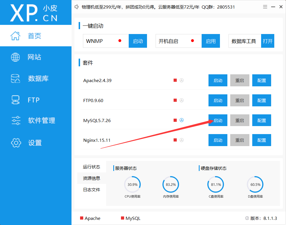 首先要打開服務(wù),先點(diǎn)擊啟動(dòng)VNMP,然后再點(diǎn)擊啟動(dòng)套件中的Apache和Mysql,F(xiàn)TP看情況,Nginx服務(wù)和Apache是一類型的,個(gè)人的話推薦Apache,二選一,具體區(qū)別自己百度。