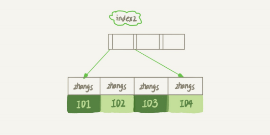 - 從index2索引樹找到滿足索引值是’zhangs’的記錄,找到的第一個是ID1;