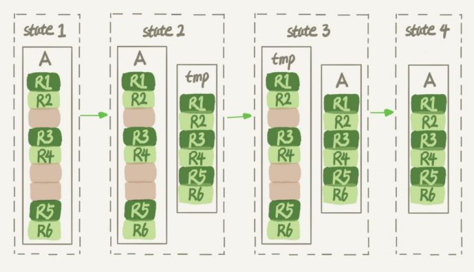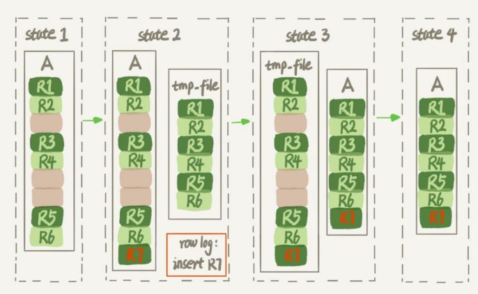 - 臨時(shí)文件生成后,將日志文件中的操作應(yīng)用到臨時(shí)文件,得到一個(gè)邏輯數(shù)據(jù)上與表A相同的數(shù)據(jù)文件,對應(yīng)的就是圖中state3的狀態(tài);