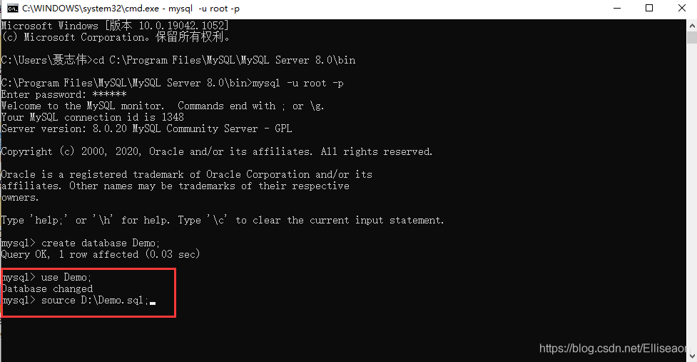 5.選中數據庫use Demo;選中導入路徑source D:/Demo.sql;