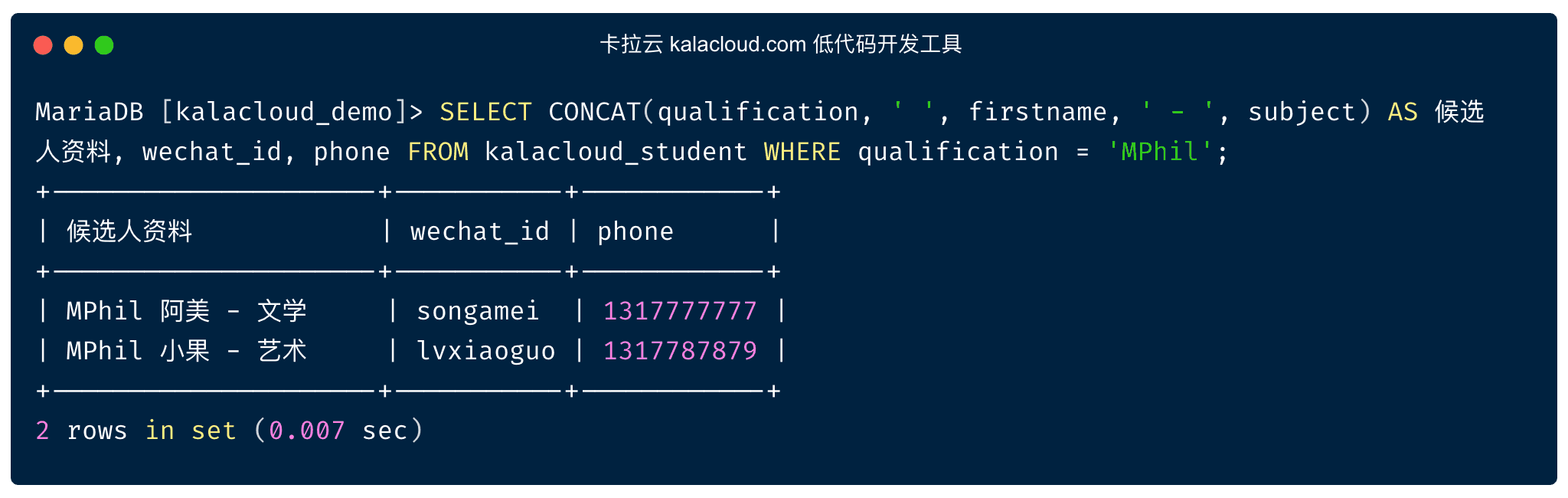 SELECT CONCAT(qualification, " ", firstname, " - ", subject) AS 候選人資料, wechat_id, phone FROM kalacloud_student WHERE qualification = "MPhil";