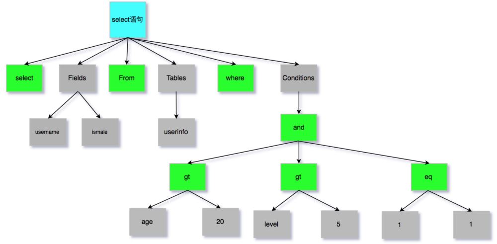 MySQL 從你輸入的"select"這個關鍵字識別出來,這是一個查詢語句。它也要把字符串“T”識別成“表名 T”,把字符串“ID”識別成“列 ID”。