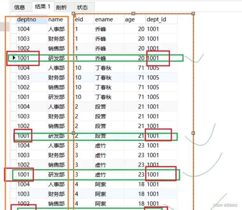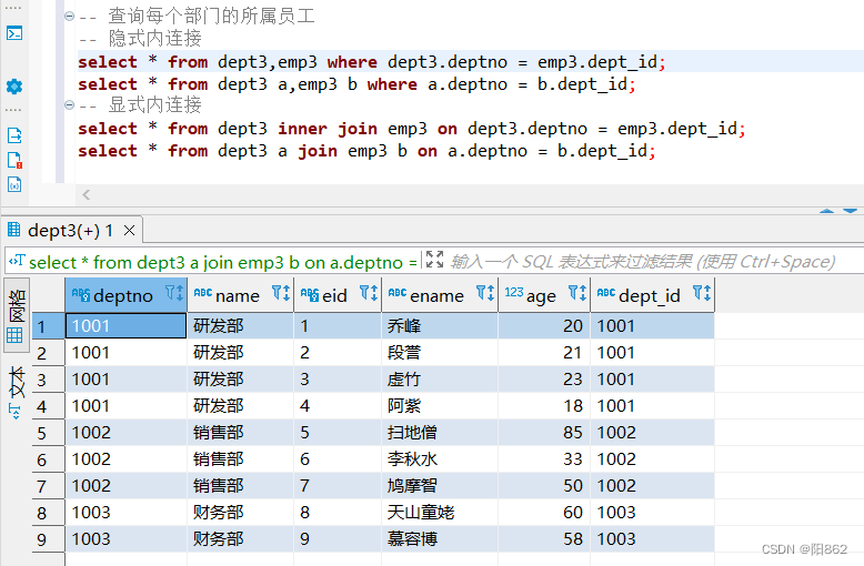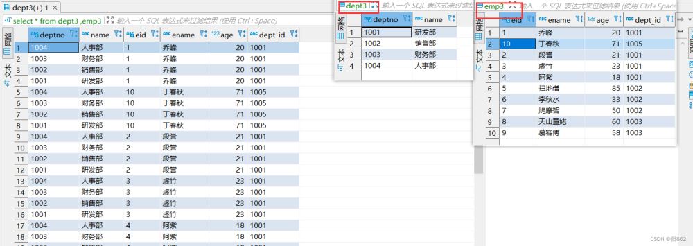 -- 創(chuàng)建部門表create table if not exists dept3( deptno varchar(20) primary key , -- 部門號 name varchar(20) -- 部門名字);-- 創(chuàng)建員工表create table if not exists emp3( eid varchar(20) primary key , -- 員工編號 ename varchar(20), -- 員工名字 age int, -- 員工年齡 dept_id varchar(20) -- 員工所屬部門);-- 給dept3表添加數(shù)據(jù)insert into dept3 values("1001","研發(fā)部");insert into dept3 values("1002","銷售部");insert into dept3 values("1003","財務部");insert into dept3 values("1004","人事部");-- 給emp3表添加數(shù)據(jù)insert into emp3 values("1","喬峰",20, "1001");insert into emp3 values("2","段譽",21, "1001");insert into emp3 values("3","虛竹",23, "1001");insert into emp3 values("4","阿紫",18, "1001");insert into emp3 values("5","掃地僧",85, "1002");insert into emp3 values("6","李秋水",33, "1002");insert into emp3 values("7","鳩摩智",50, "1002"); insert into emp3 values("8","天山童姥",60, "1003");insert into emp3 values("9","慕容博",58, "1003");insert into emp3 values("10","丁春秋",71, "1005");交叉連接查詢