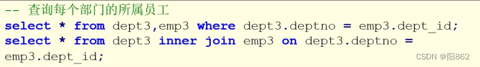 -- 查詢研發(fā)部門的所屬員工-- 隱式內(nèi)連接select * from emp3 e ,dept3 d where e.dept_id =d.deptno and name ="研發(fā)部";-- 顯式內(nèi)連接select * from dept3 d join emp3 e on d.deptno =e.dept_id and name ="研發(fā)部"; -- 查詢研發(fā)部和銷售部的所屬員工select * from dept3 a join emp3 b on a.deptno = b.dept_id and (name = "研發(fā)部" or name = "銷售部") ; select * from dept3 a join emp3 b on a.deptno = b.dept_id and name in("研發(fā)部" ,"銷售部") ; -- 查詢每個部門的員工數(shù),并升序排序 select a.name,a.deptno,count(1) from dept3 a join emp3 b on a.deptno = b.dept_id group by a.deptno,name; -- 查詢?nèi)藬?shù)大于等于3的部門,并按照人數(shù)降序排序 select a.deptno, a.name, count(1) as total_cntfrom dept3 a join emp3 b on a.deptno = b.dept_idgroup by a.deptno,a.namehaving total_cnt >= 3order by total_cnt desc;外連接