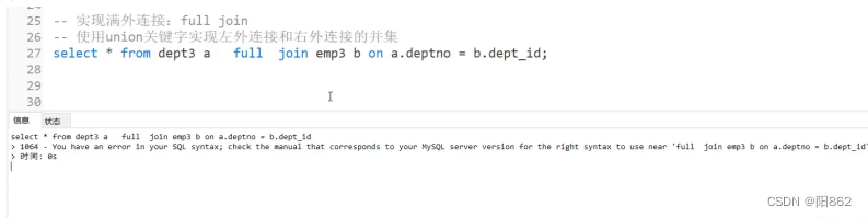 -- 外連接查詢-- 查詢哪些部門有員工,哪些部門沒有員工select * from dept3 left outer join emp3 on dept3.deptno = emp3.dept_id;-- 查詢員工有對應的部門,哪些沒有select * from dept3 right outer join emp3 on dept3.deptno = emp3.dept_id;-- 使用union關鍵字實現(xiàn)左外連接和右外連接的并集select * from dept3 left outer join emp3 on dept3. deptno = emp3.dept_idunionselect * from dept3 right outer join emp3 on dept3.deptno = emp3.dept_id;